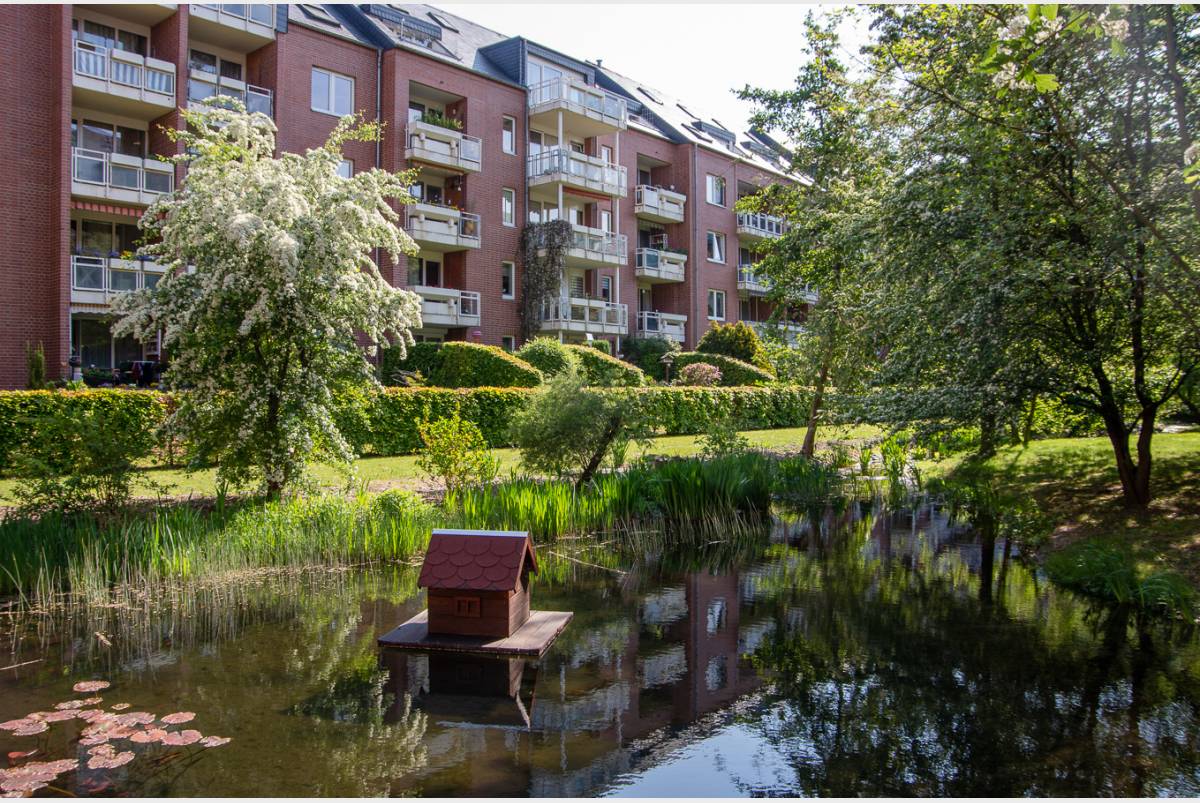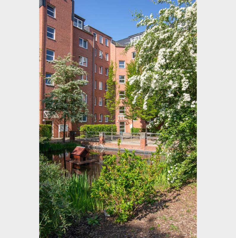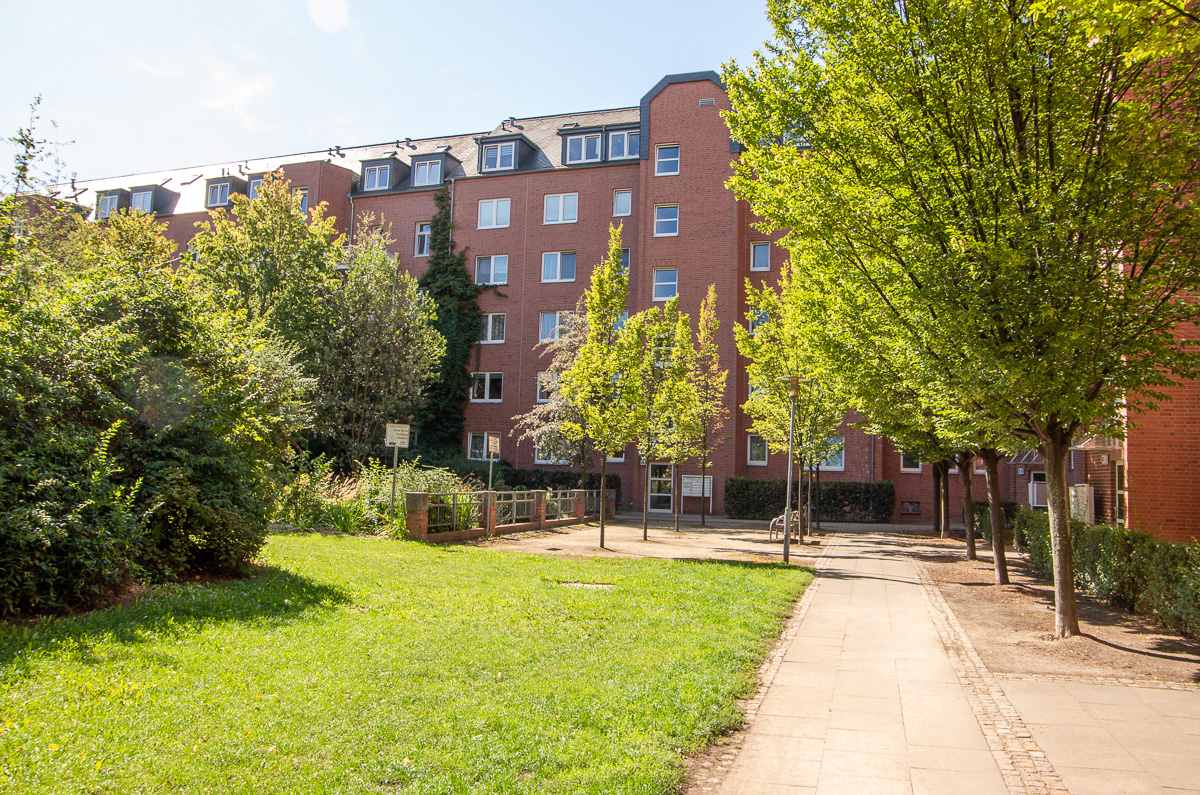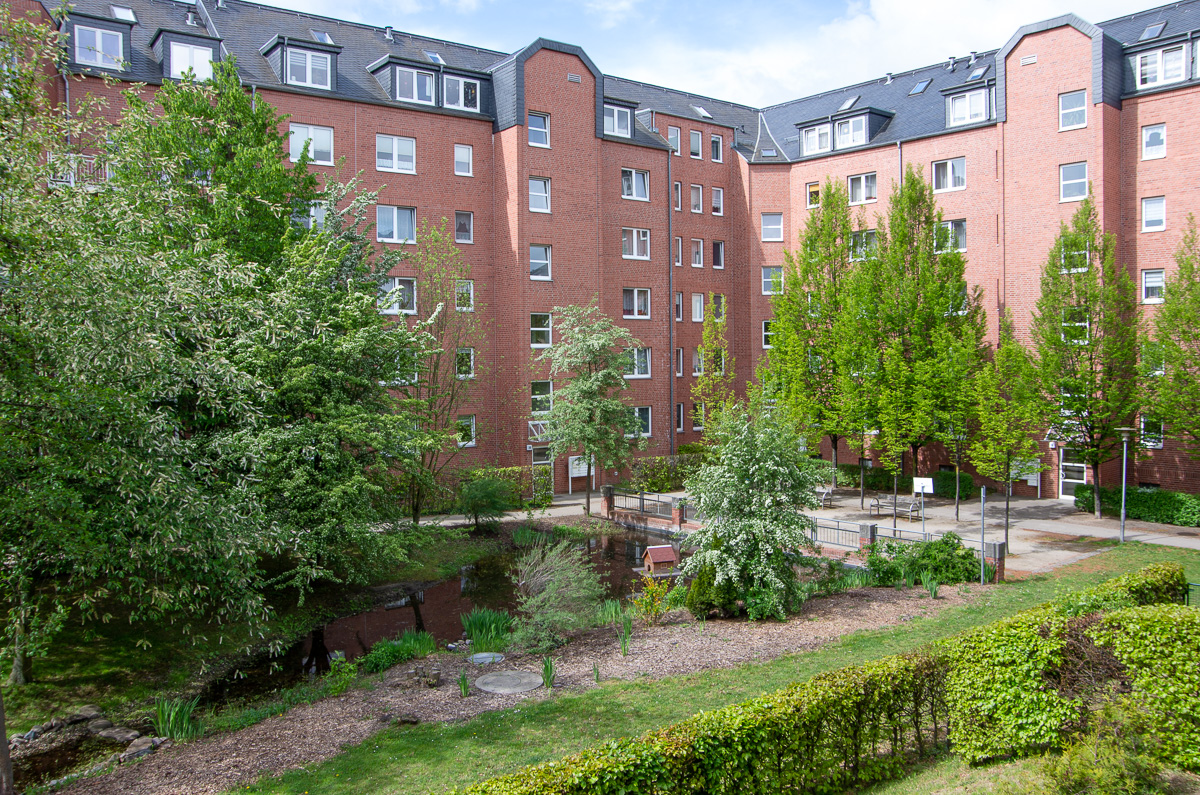 Haus in geschlossener Karreebebauung. Im geschützten, grünen Innenhof befindet sich auf einer weitläufigen Wiese ein angelegter Bachlauf mit Teich. Nur wenige Schritte entfernt liegt ein schöner Kinderspielplatz mit Spielburg, Sandfläche und Sitzgelegenheiten.